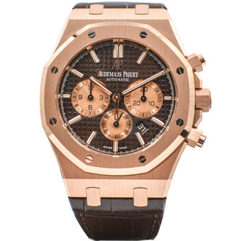 This Audemars Piguet Royal oak Chronohraph , Unworn, Rose gold 18k and leather strap 41mm with brown dial, production year 2021, Excellent condition, Mechanized by automatic movement caliber 2385, includes box and paper.