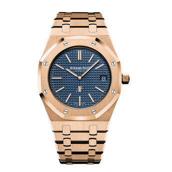 Audemars Piguet Royal Oak "Jumbo" Extra-Thin (15202OROO1240OR01) self-winding automatic watch, features a 39mm 18k rose gold case surrounding a blue Petite Tapiserrie dial on an 18k rose gold bracelet with folding buckle. Functions include hours, minutes, seconds and date. This watch has been serviced and comes with the Original box , Time remaining on the Manufacturer's service warranty 2019.