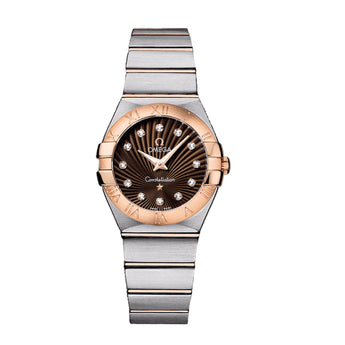 This brushed model features a brown dial decorated with a supernova pattern, marked with diamond-set indexes and covered by a scratch-resistant sapphire crystal. The 18K red gold bezel, with its engraved Roman numerals, is mounted on a 27 mm stainless steel casebody, and is presented on a stainless steel and 18K red gold bracelet.