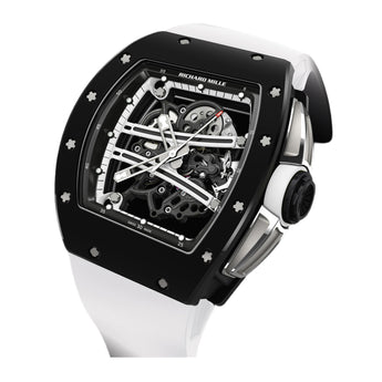 The monochrome edition of the RM61-01 is a 50-piece limited edition run that features a white monochromatic inner bezel that displays the modern, asymmetrical work put into the construction of the RM61-01. The RM61-01 comes with an asymmetrical tonneau-shaped case that is 42.7mm x 50.23mm with a black ceramic bezel and a black TZP carbon case band. Box And Papers 2015