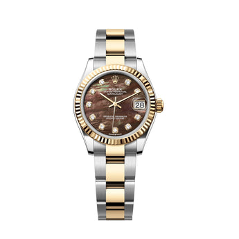 This Rolex 278273 , 2022 Worn , 31mm yellow Rolesor case comprised of Oystersteel and 18K yellow gold, screw-down back, screw-down crown with twinlock double waterproofness system, 18K yellow gold fluted bezel, scratch-resistant sapphire crystal with cyclops lens over the date, dark grey dial, diamond hour markers, Rolex calibre 2236 perpetual self-winding movement with date at 3 o'clock, approximately 55 hours of power reserve, yellow Rolesor Oyster bracelet made from a combination of 904L steel and 18K yellow gold with flat three-piece links, folding Oysterclasp buckle with Easylink 5mm comfort extension link. Waterproof to 100 meters.