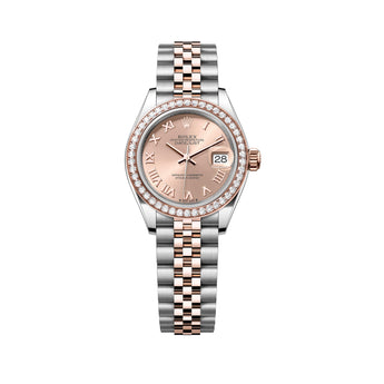 28mm Everose Rolesor case comprised of a 904L steel monobloc middle case, screw-down steel back, 18K Everose gold screw-down crown with twinlock double waterproofness system, 18K Everose gold diamond bezel, scratch-resistant sapphire crystal with cyclops lens over the date and double anti-reflective coating, pink dial, Roman numerals, Rolex calibre 2236 automatic movement with center hour, minute and seconds hands, instantaneous date with rapid setting, and stop-seconds for precise time setting, Everose Rolesor Oyster bracelet comprised of a combination of 904L steel and 18K Everose gold in flat three-piece links, folding Oysterclasp buckle with Easylink 5mm comfort extension link. Waterproof to 100 meters. its