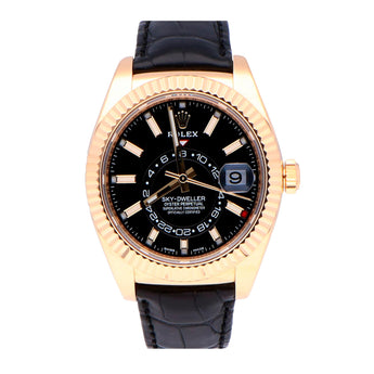 Pre-Owned Rolex Sky-Dweller (326138) self-winding automatic watch, features a 42mm 18k yellow gold case surrounding a black dial on a brown alligator strap with an 18k yellow gold deployant buckle. Functions include hours, minutes, seconds, annual calendar and GMT. This watch comes with the original box and papers. Worn 2019