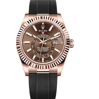 This Rolex 326235 choi Everose Gold Sky-Dweller Watch 2022 - Chocolate Index Dial - Oyster flex Bracelet 42mm 18K Eve rose gold case, screw-down back, screw-down crown with twin lock double waterproofness system, fluted bezel, scratch-resistant sapphire crystal with cyclops lens over the date, chocolate dial, index hour markers, Rolex caliber 9001 automatic movement with 24-hour display on off-center disc, second time zone, instantaneous annual calendar at 3 o'clock and rapid-setting of the date, month display via 12 apertures around the circumference of the dial, stop-seconds for precise time setting, approximately 72 hours of power reserve, Oyster flex bracelet made from flexible metal blades overmoulded with high-performance elastomer, folding Oyster clasp buckle with glide lock extension system. Waterproof to 100 meters.
